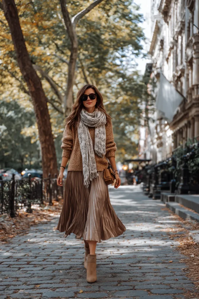 This outfit blends autumn warmth with boho grace. A chunky caramel-toned knit sweater pairs beautifully with a flowing pleated skirt in a soft bronze hue. The lightweight printed scarf adds just the right touch of texture and coziness, while tan ankle boots and a small crossbody bag keep the look effortlessly balanced. It’s that perfect mix of snug and sophisticated.