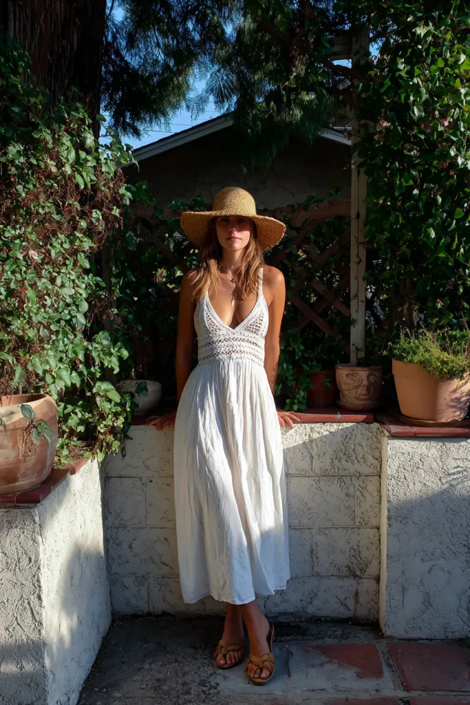 This outfit is the essence of easy boho elegance. A flowy white sundress with crochet details pairs perfectly with a wide-brimmed straw hat and simple tan sandals. The natural textures and light fabric make it feel breezy and carefree, while the soft silhouette adds a touch of romance that never goes out of style.