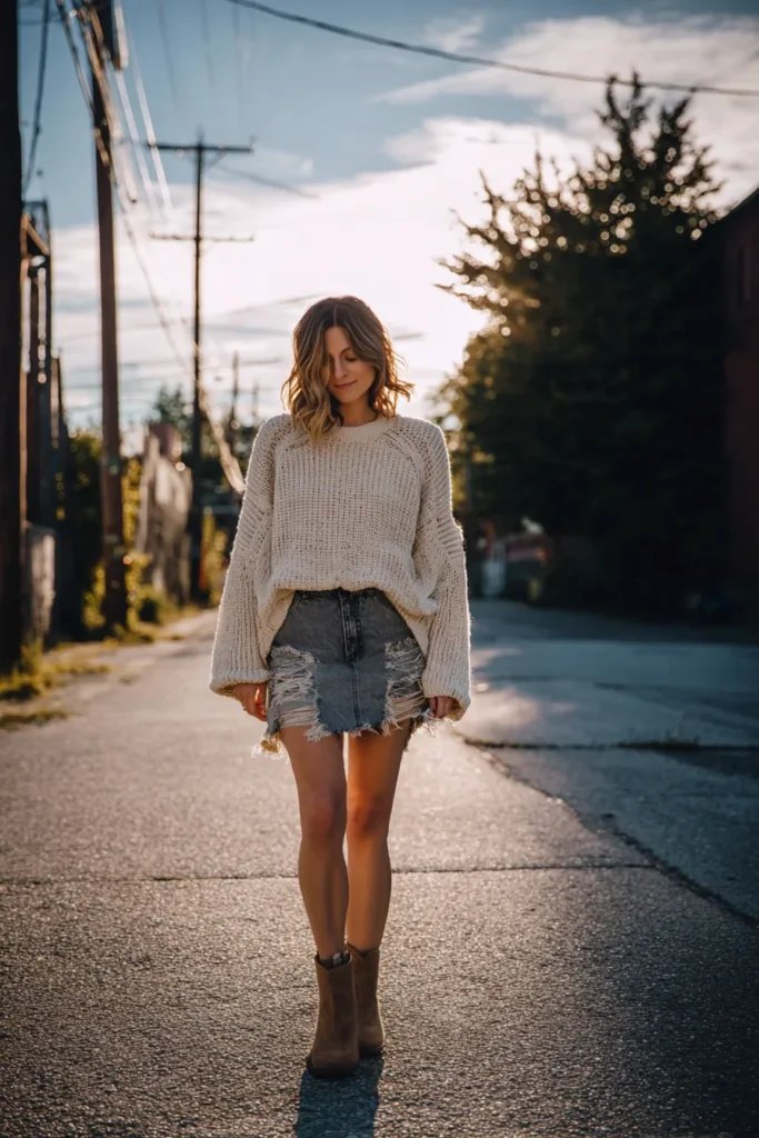 This look captures the perfect mix of cozy and edgy. The oversized cream knit sweater adds instant softness, while the frayed denim mini skirt keeps things playful and a little undone. The warm brown ankle boots tie the outfit together beautifully, giving it that laid-back boho finish that feels right at home in golden hour light.