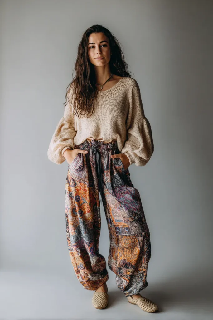 This outfit is the perfect example of cozy boho style done right. The loose beige knit sweater adds softness and warmth, pairing beautifully with the bold patterned harem pants in rich tones of orange, purple, and rust. Woven flats complete the earthy vibe, while the slightly tucked sweater keeps the look balanced and flattering instead of overwhelming.