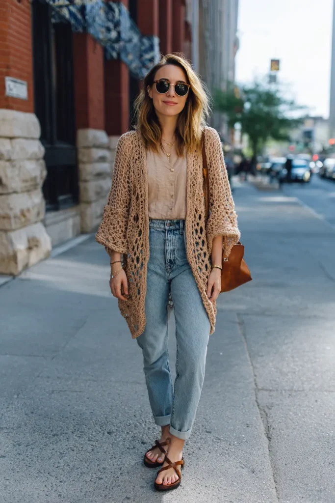 This look captures that perfect mix of effortless and intentional. A loose crochet cardigan in a warm sandy hue layers beautifully over a lightweight beige top tucked into high-waisted, softly faded jeans. The rolled cuffs, brown leather sandals, and matching shoulder bag keep things grounded and simple, while gold jewelry and round sunglasses add just the right touch of polish.