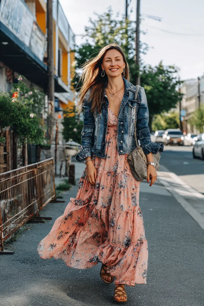 This outfit brings together the best of boho charm and everyday ease. The soft floral maxi dress flows beautifully with every step, creating that dreamy, feminine silhouette that never goes out of style. Layered with a slightly faded denim jacket and paired with brown strappy sandals, the look feels perfectly balanced between relaxed and refined. The silver crossbody bag and simple layered jewelry tie everything together with a subtle touch of shine.