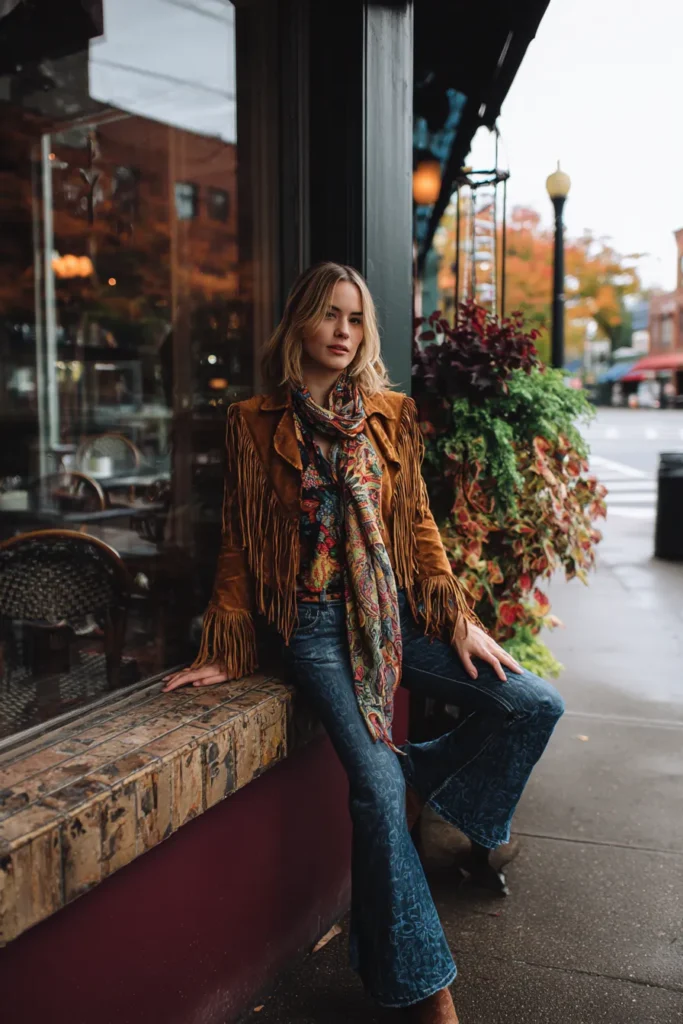 This outfit gives pure boho confidence with a touch of Western charm. She’s wearing a tan suede fringe jacket layered over a floral blouse that adds a pop of color and pattern. The flared jeans with subtle embroidery details bring that vintage flair, while the printed scarf ties everything together beautifully. It’s playful, cozy, and full of personality—like the kind of look that turns heads but still feels totally down-to-earth.