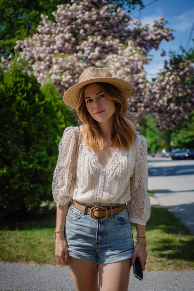This outfit perfectly captures that easygoing boho spirit with a romantic twist. The woman is wearing a delicate cream lace blouse with soft puff sleeves and a deep neckline, tucked effortlessly into high-waisted light denim shorts. A tan woven belt adds warmth and structure, while the straw hat ties everything together with a relaxed, sun-soaked vibe. The textures of lace and denim balance each other beautifully, giving off a breezy, feminine feel that’s both timeless and casual.