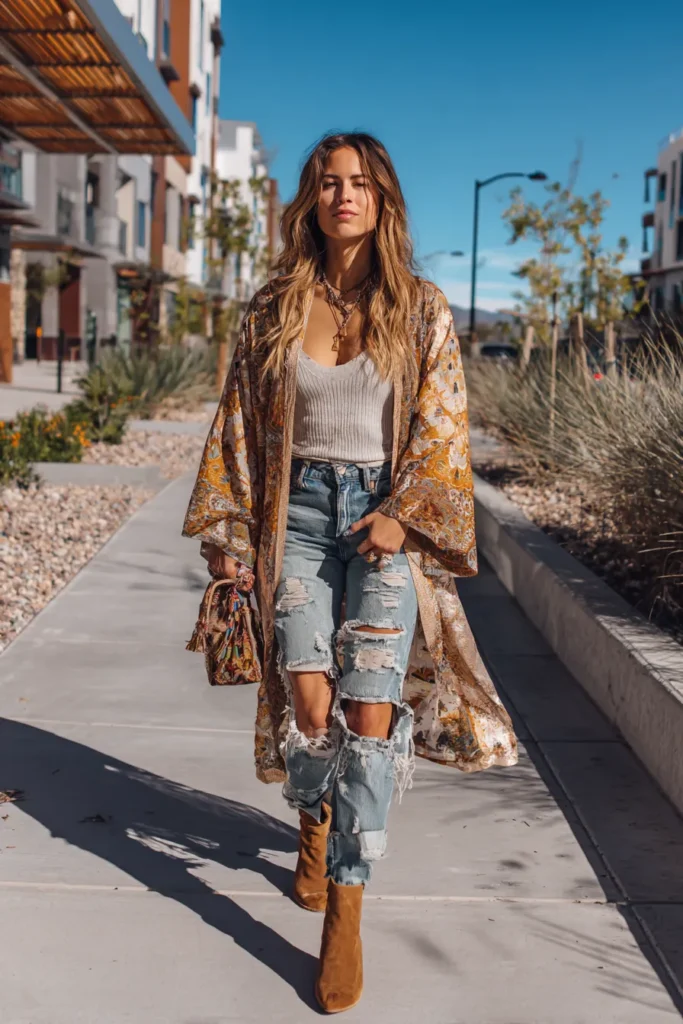 I adore how this outfit nails that “undone but stylish” balance. The kimono adds drama without feeling heavy, and those ripped jeans keep things grounded and easy to wear. It’s the kind of outfit I’d throw on when I want to look like I just naturally have great taste, even if I only spent five minutes getting ready. It’s boho confidence at its best.