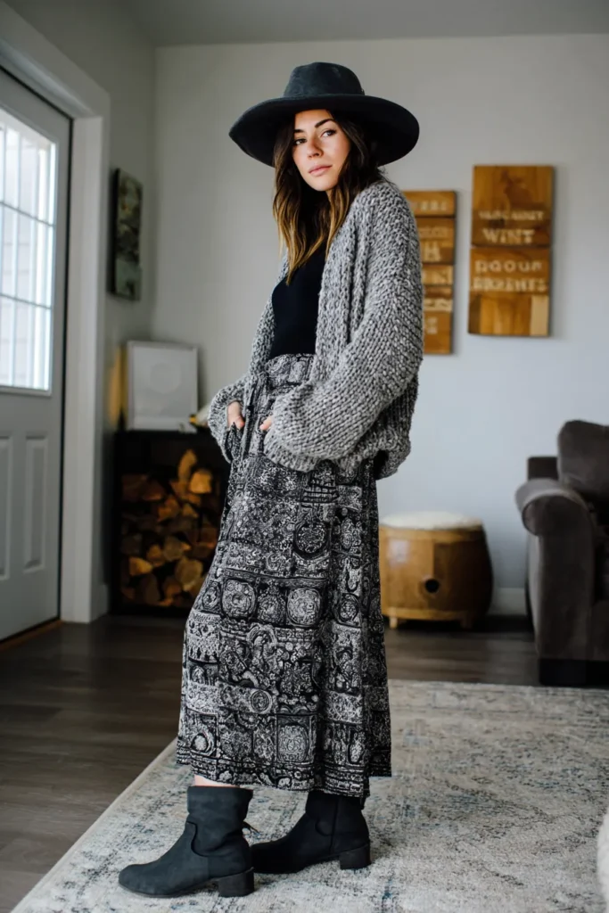This outfit is the perfect mix of cozy comfort and boho charm. She’s wearing a chunky gray knit cardigan layered over a fitted black top, paired with a flowy black-and-white printed maxi skirt. The wide-brim hat adds that effortless boho edge, while the black suede ankle boots pull everything together with a grounded touch. It’s relaxed, textural, and ideal for chilly mornings or slow afternoons at home.