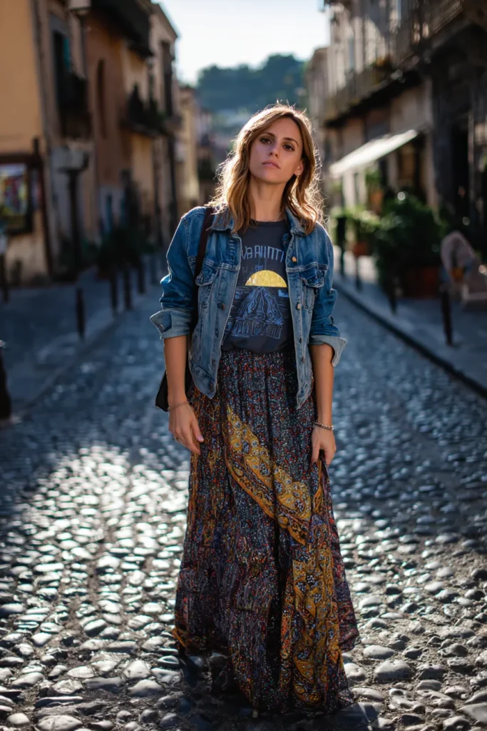 This outfit nails that effortlessly chic street boho look. She’s wearing a faded denim jacket layered over a vintage-style graphic tee, paired with a flowy maxi skirt in earthy tones of mustard, navy, and rust with a paisley-inspired print. The soft fabrics and relaxed fit give it an easy, breezy feel while the textures make it look intentionally styled. It’s the perfect balance of casual and artistic.