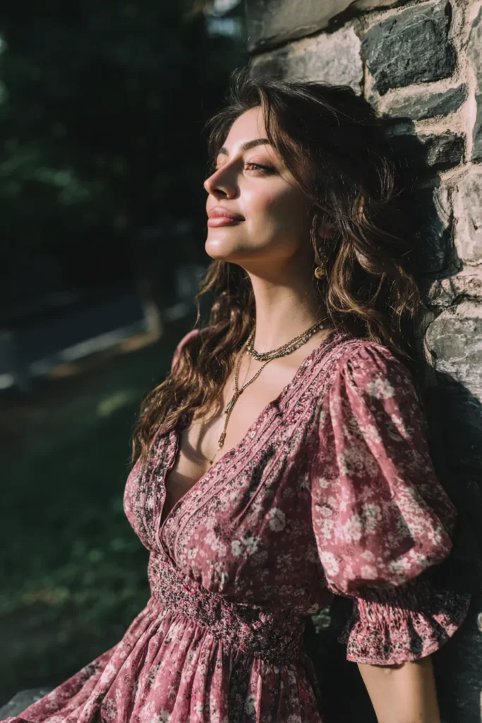 This outfit is all about soft, feminine charm with a hint of vintage flair. She’s wearing a dusty rose floral dress with puff sleeves and a smocked waist that flatters the figure while keeping things comfortable. The flowy fabric catches the sunlight beautifully, and the layered gold necklaces add just the right touch of boho glam. It’s romantic, airy, and full of personality.