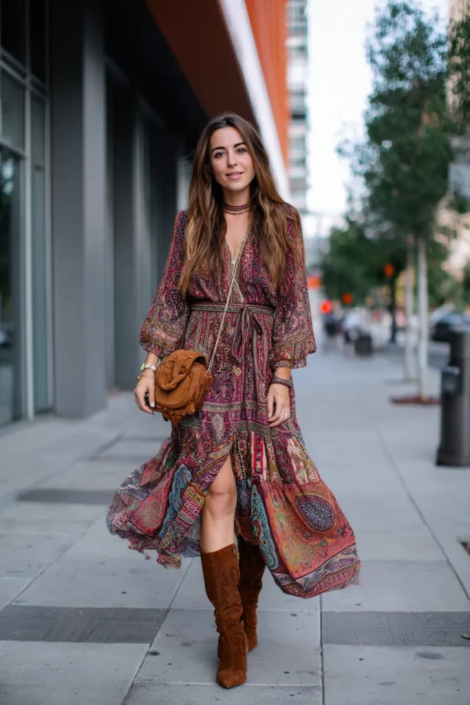 This look is boho perfection from head to toe. She’s wearing a colorful paisley-print maxi dress with a flowy silhouette and a belted waist that adds just the right amount of shape. The earthy tones of burgundy, teal, and mustard play beautifully together, giving it that effortless bohemian feel. Paired with knee-high suede boots and a small tan crossbody bag, it strikes the perfect balance between free-spirited and polished.