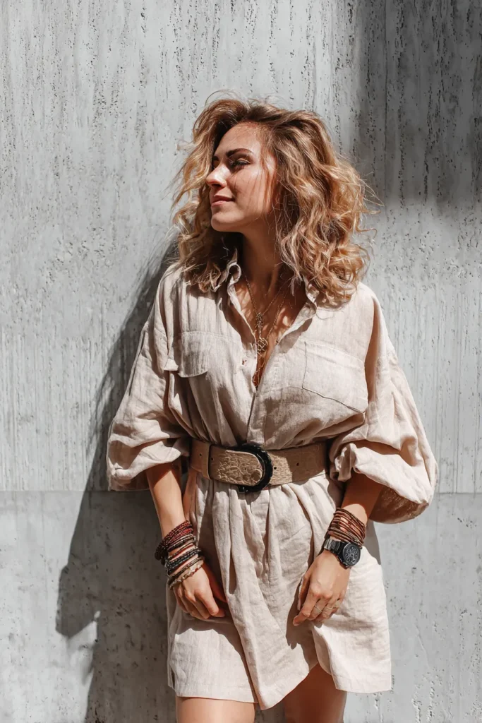 This look is pure effortless chic with a natural boho twist. She’s wearing a light beige linen shirt dress with rolled sleeves and a wide textured belt that cinches the waist perfectly. The fabric looks breezy and comfortable, catching the sunlight in all the right ways. Stacked bracelets, layered necklaces, and loose curls give the outfit that free-spirited, sun-kissed vibe that makes it feel both stylish and undone in the best way.