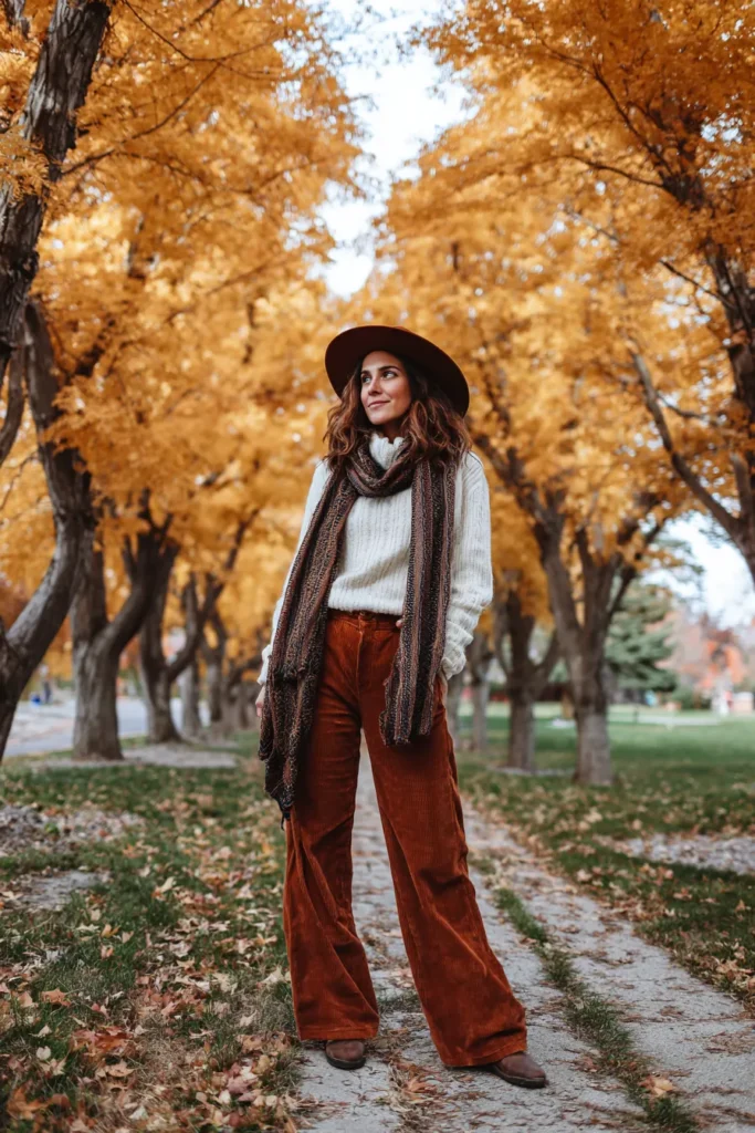 This outfit is the ultimate fall boho dream. She’s wearing high-waisted rust-colored corduroy pants paired with a chunky cream turtleneck sweater that looks as soft as it feels. A long striped scarf drapes effortlessly over her shoulders, adding warmth and texture, while a wide-brim hat in a deep earthy tone completes the look. Surrounded by golden autumn leaves, it feels like the season was made for this outfit.