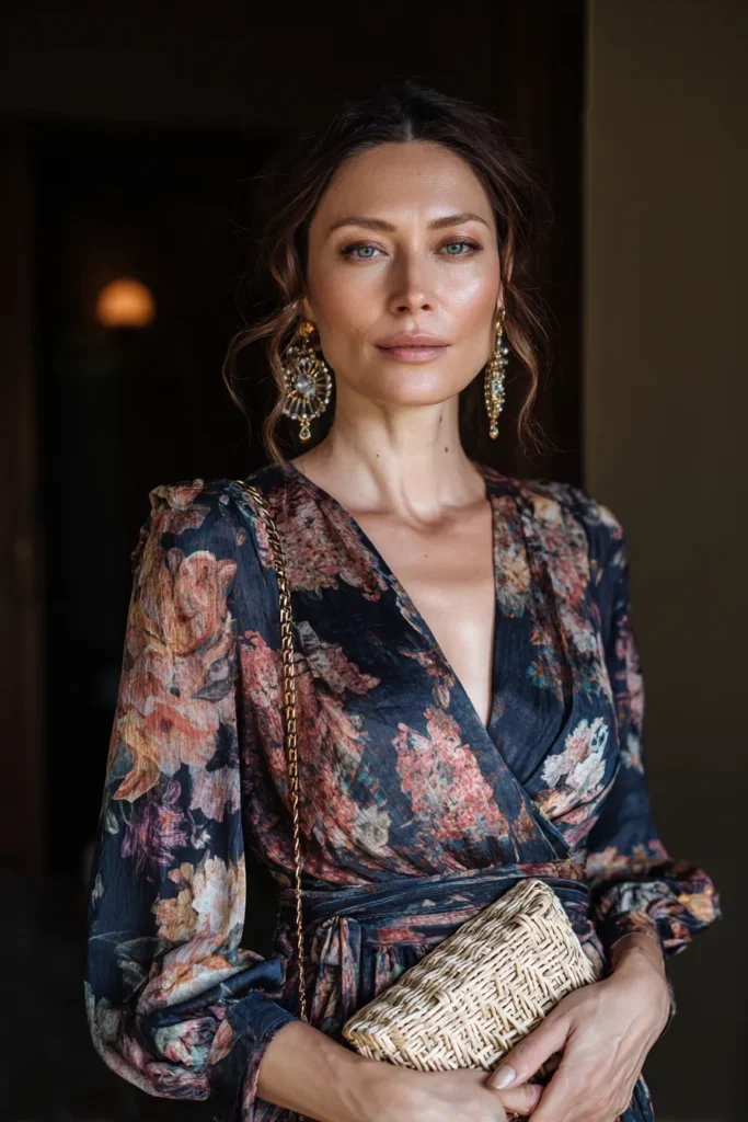 This outfit brings a refined take on bohemian style. She’s wearing a silky wrap dress with a moody floral print in deep shades of navy, rose, and amber. The fabric drapes beautifully, cinching softly at the waist for a feminine silhouette. Gold statement earrings and a woven clutch complete the look, giving it that perfect mix of luxury and natural texture that makes boho style so timeless.