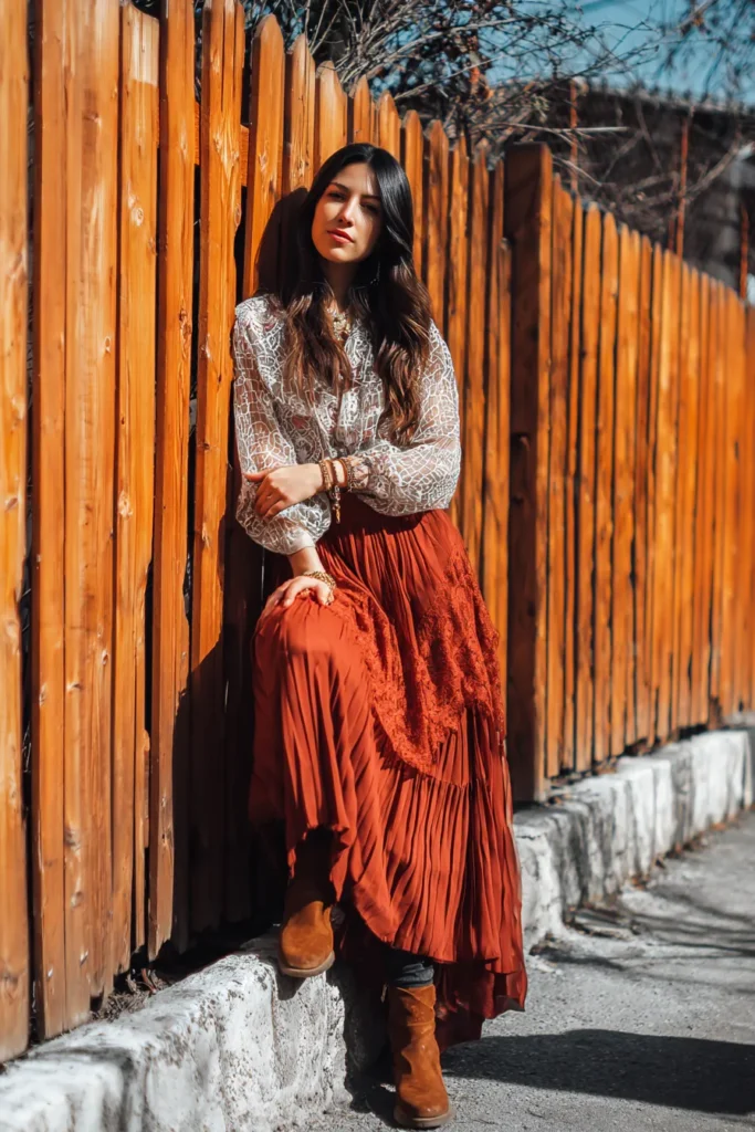 This outfit is a perfect blend of romantic and boho energy. She’s wearing a flowy rust-colored maxi skirt with delicate lace detailing that catches the light beautifully, paired with a sheer white lace blouse that adds texture and softness. The earthy suede boots complete the look, keeping it grounded while still feeling effortlessly elegant. The warm color palette makes it ideal for those crisp autumn days when you still want to look feminine and free-spirited.