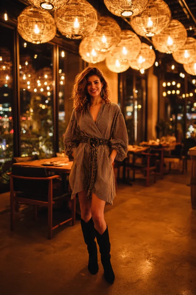 This outfit is the perfect mix of boho ease and night-out sophistication. She’s wearing a striped shirt dress with voluminous sleeves, cinched at the waist with a wide statement belt that defines her figure perfectly. The fabric drapes softly while the black knee-high boots add a confident, modern edge. With the warm restaurant lighting and her effortless curls, the whole look gives off that relaxed-but-intentional vibe that makes boho style so magnetic.