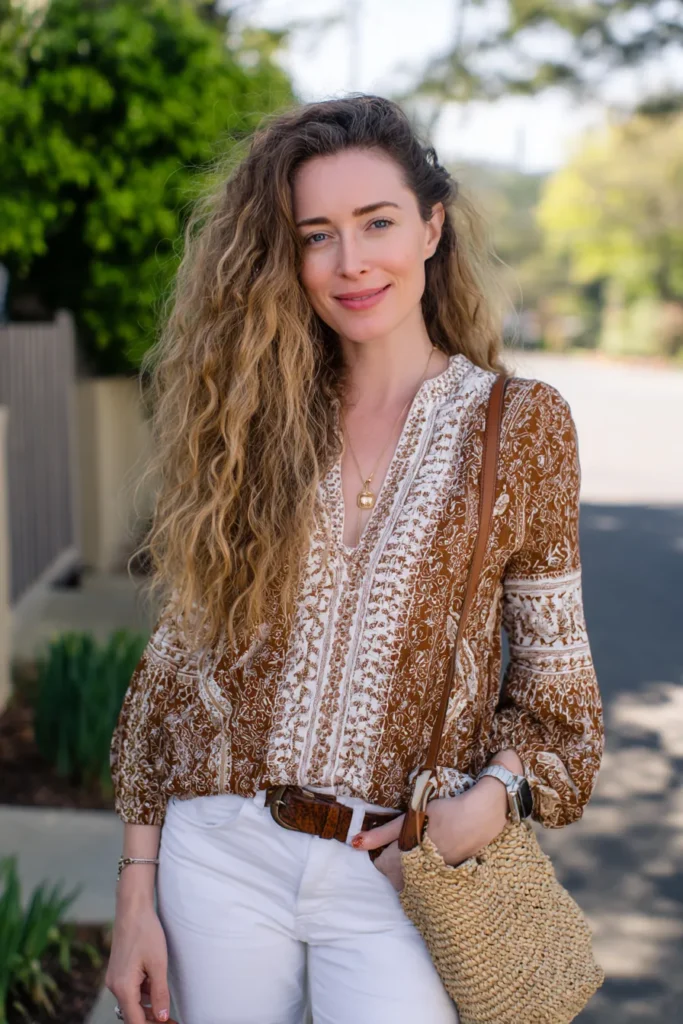 This outfit captures the softer, more polished side of boho style. She’s wearing a flowy printed blouse in warm earthy tones of brown and cream, tucked into crisp white jeans for a clean and fresh contrast. The woven straw bag and simple gold jewelry complete the look, adding that easygoing, sunlit charm that feels made for spring days. It’s relaxed, natural, and effortlessly pretty.