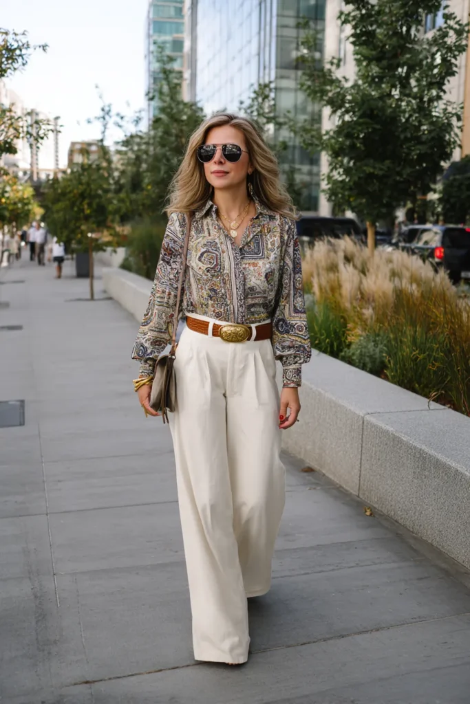 This outfit gives boho style a sophisticated upgrade. She’s wearing a paisley-print blouse in soft earthy tones paired with high-waisted cream wide-leg trousers that flow beautifully with every step. A bold statement belt with a gold buckle adds definition and polish, while the layered jewelry and aviator sunglasses complete the effortlessly chic vibe. It’s refined, free-spirited, and perfect for city strolls or casual lunches.