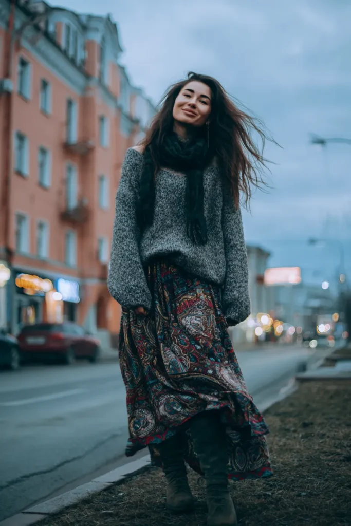 This outfit is the ultimate cool-weather boho look. She’s wearing a chunky gray knit sweater paired with a flowing paisley maxi skirt in rich jewel tones. The cozy textures and deep colors create that perfect balance between relaxed and effortlessly stylish. A soft black scarf adds an extra layer of warmth, while the suede boots keep everything grounded and practical for chilly evenings.