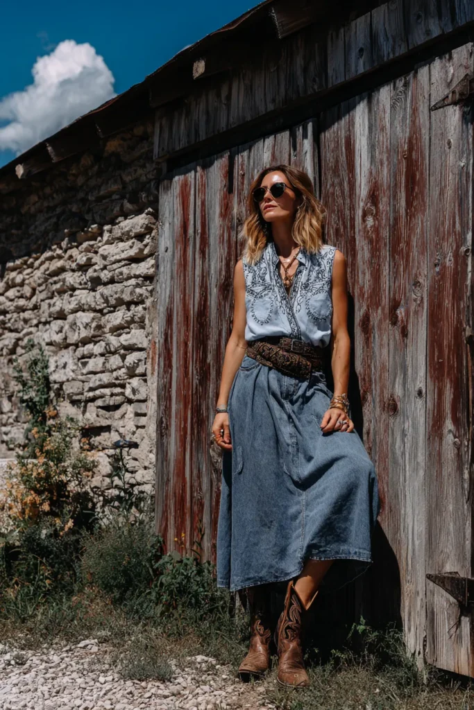 This outfit blends bohemian ease with a little western edge. She’s wearing a sleeveless embroidered top tucked into a faded denim midi skirt, cinched perfectly with a patterned belt that adds texture and shape. Layered necklaces, stacked bracelets, and classic brown cowboy boots bring everything together with that effortless, free-spirited energy. The whole look feels grounded yet adventurous, like it’s made for sunny days and open skies.