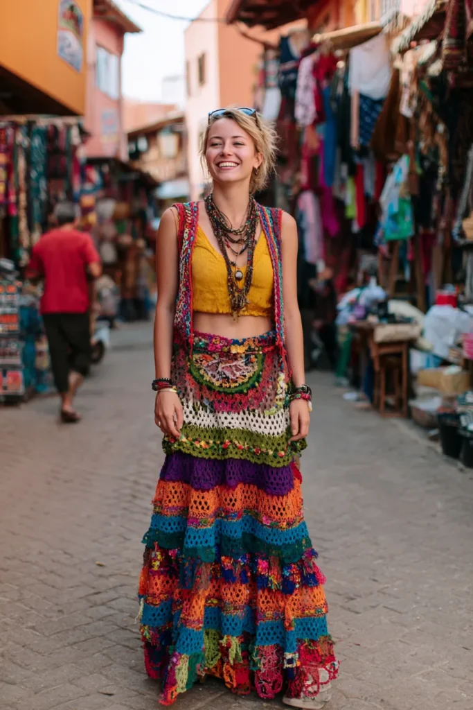 This outfit is pure sunshine in clothing form. She’s wearing a mustard yellow crop top paired with a colorful crochet maxi skirt bursting with layers of orange, blue, green, and purple. A matching crochet vest ties the look together, while stacked beaded necklaces and bracelets add even more personality. The whole outfit feels carefree and creative, like something you’d wear to explore a local market on a warm afternoon.