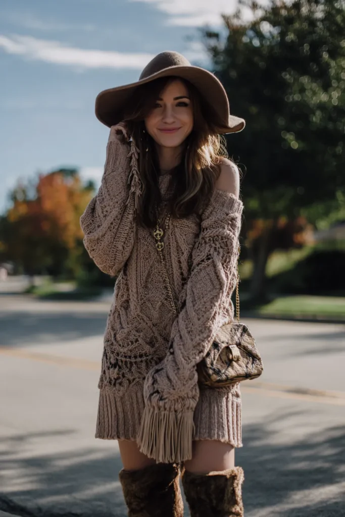 This outfit is pure autumn perfection. She’s wearing an oversized knit sweater dress in a warm beige tone with chunky cable detailing and fringed sleeves that give it that laid-back boho twist. A wide-brim hat and furry knee-high boots add cozy texture, while a small patterned crossbody bag ties everything together in the most charming way. It’s soft, neutral, and full of personality.