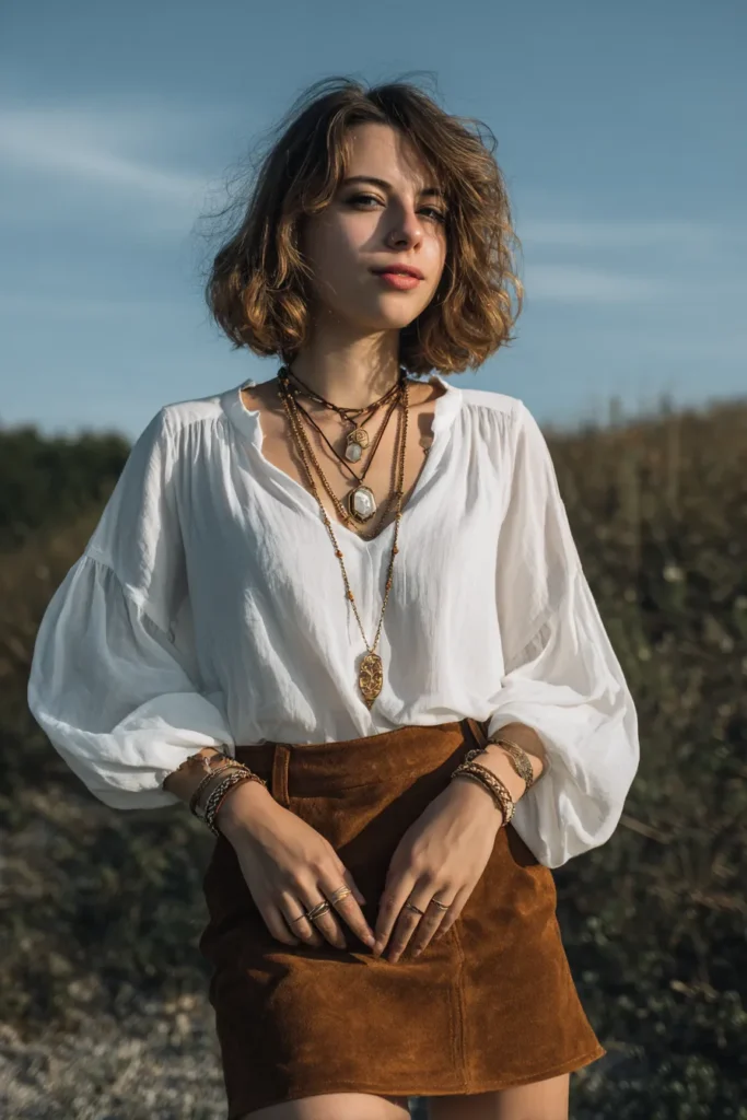 This outfit nails the art of simple yet striking boho style. She’s wearing a flowy white blouse with puffed sleeves that catch the light perfectly, tucked into a caramel-brown suede mini skirt that adds just the right amount of texture. Layered gold necklaces and stacked bracelets give the whole look a free-spirited energy, while the earthy tones make it feel natural and grounded.