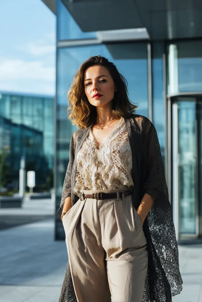This outfit blends boho romance with modern polish. She’s wearing a delicate lace camisole in soft cream tucked into high-waisted beige trousers that drape beautifully with a tailored yet relaxed fit. A sheer charcoal kimono adds texture and flow, creating that effortless contrast between structured and free. Minimal gold jewelry and a light brown belt pull it all together with quiet sophistication.