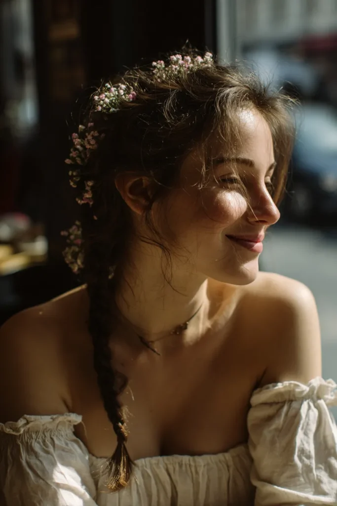 This look screams soft romance with a gorgeous off-the-shoulder peasant top. It looks like it’s made from a light airy natural fabric like crinkled cotton or maybe soft linen in a creamy, almost antique white shade. The gentle ruching around the neckline adds so much texture and that lovely flowy sleeve effect gives it that carefree boho spirit. Paired with the delicate tiny flowers woven into a loose braid and what looks like a simple natural pendant necklace, the whole vibe is just sun-drenched and utterly ethereal.