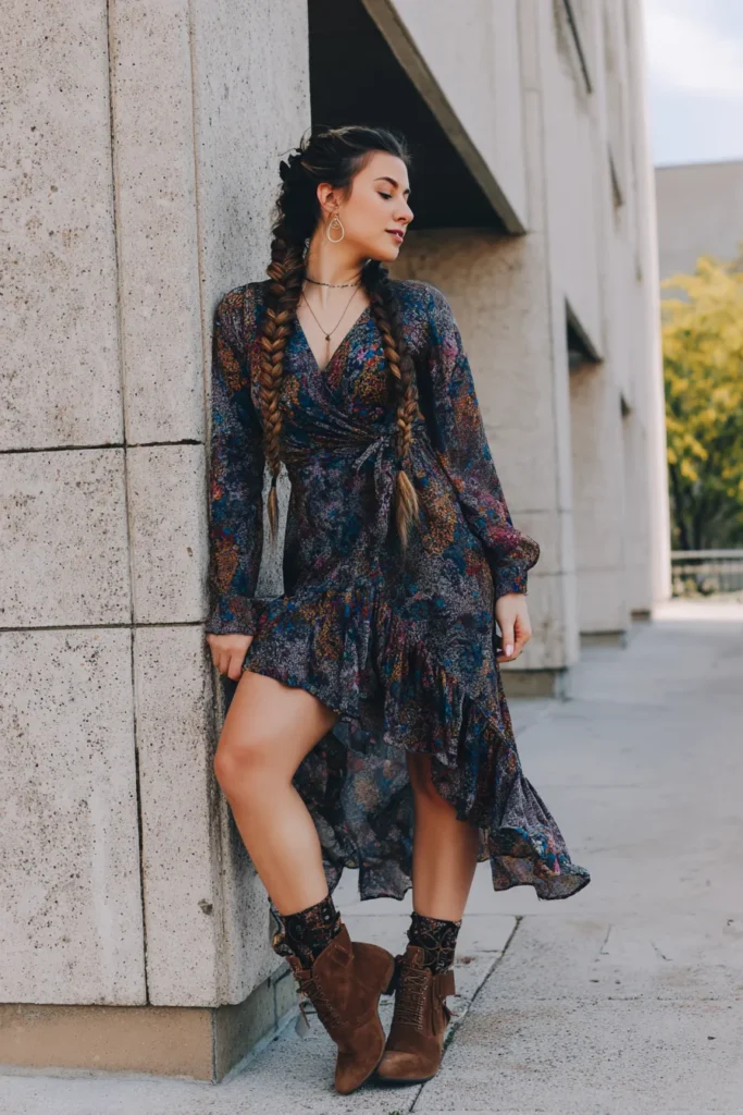 This outfit pairs a stunning wrap dress with a rich, dark tapestry of colors, maybe deep navy or charcoal as a base, covered in intricate paisley or muted floral patterns. The dress features long sleeves and a flirty high-low ruffled hemline, giving it gorgeous movement. To keep things grounded for cooler weather or just for that perfect edge, she’s styled it with chunky brown lace-up ankle boots worn over some fun patterned socks that peek out just right. The hair is styled in two chunky, relaxed braids which perfectly frame the look and keep all the focus on the lovely print.
