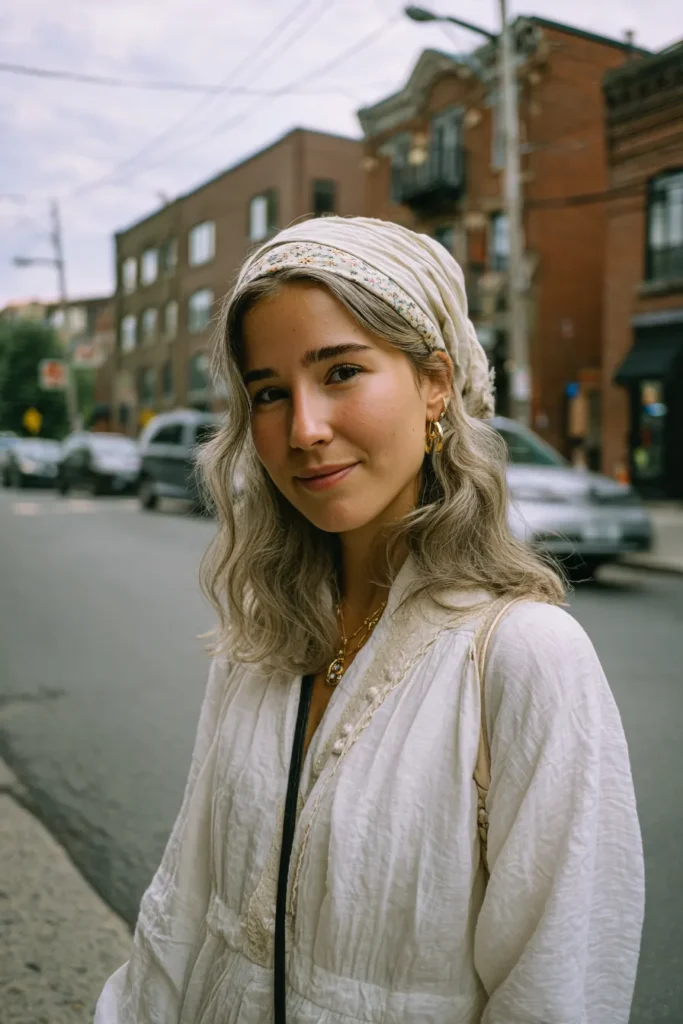 I think this ensemble is pure effortless summer magic. The monochromatic light clothing keeps everything feeling airy and fresh while the soft texture of the fabric is just so comfortable and flattering. That simple patterned scarf is the ultimate accessory it screams vintage wanderer chic and it keeps your hair perfectly styled without trying too hard. I feel like I could be exploring an old European city or just enjoying a sunny afternoon walk in this. It’s the perfect example of how less color can sometimes make a bigger impact.