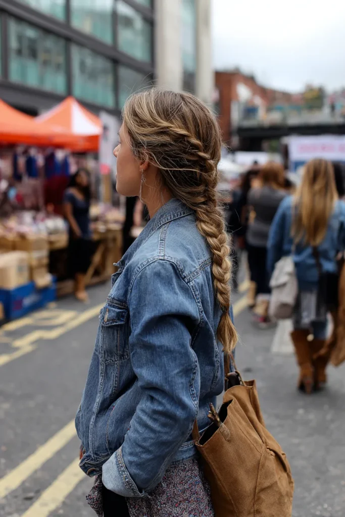 This outfit is the perfect grab-and-go ensemble for exploring a bustling outdoor market or hitting the city streets on a cool day. It features a classic, slightly oversized blue denim jacket worn over what looks like a subtly patterned or ditsy floral piece peeking out underneath. The whole look is topped off with a roomy, casual brown suede or canvas tote bag slung over the shoulder. The hair is styled in a gorgeous, slightly messy fishtail or Dutch braid that is pulled loosely around the crown, giving that lovely, wind-tousled texture we all strive for.