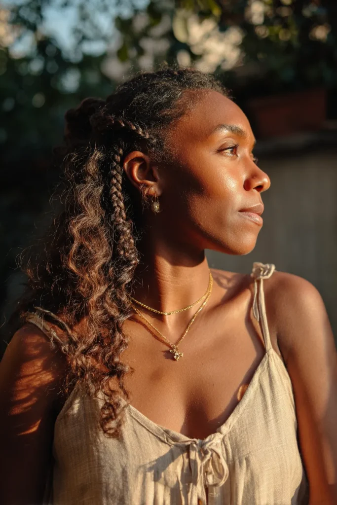 This look celebrates natural beauty with a simple yet stunning linen or linen-blend cami dress in a gorgeous neutral shade like oatmeal or light beige. The fabric looks wonderfully light and breathable, perfect for soaking up the last bit of golden hour sunshine. The hair is a perfect mix of texture and detail featuring natural curls worn half-up with some sections intricately braided near the crown, letting the rest flow down freely. Simple gold jewelry, like layered necklaces with tiny charms and delicate drop earrings, adds just the right amount of sparkle against the warm skin tone.