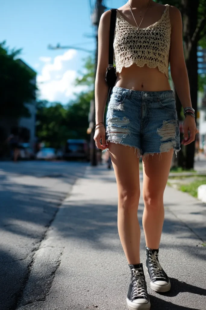 I absolutely adore how these pieces play off each other for an easy, breezy style. The open knit of the crochet top feels so breathable and perfectly channels that easy-going festival or boardwalk aesthetic. Pairing it with those heavily ripped shorts immediately gives it that grunge, I just threw this on and look amazing vibe. Plus, the Converse are the ultimate footwear for walking around all day, making this outfit not only super cute but totally practical for exploring when the weather is warm.