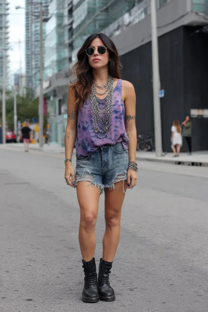 This ensemble perfectly captures that urban explorer meets music festival aesthetic. The centerpiece is a purple and blue tie-dye tank top, left loose over a pair of severely distressed, light-wash denim cutoff shorts showing off tons of leg. The grunge factor gets seriously cranked up with a massive, cascading statement necklace made of thick silver chains, mirrored round sunglasses, and chunky black lace-up combat boots. The mix of soft color, ripped texture, and hard metal is everything.