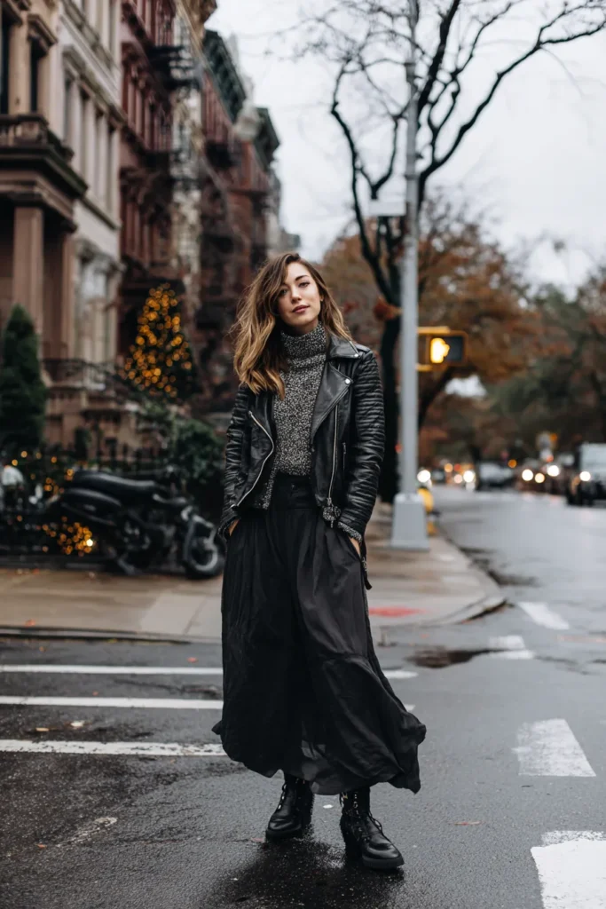 This look is perfect for a crisp, moody city day where you still want to keep that cool edge. The outfit layers a cozy, textured grey or salt-and-pepper knit turtleneck sweater underneath a classic black quilted leather moto jacket. For bottoms, we have dramatic flowing black maxi culottes or a pleated skirt that moves beautifully, all anchored by heavy-duty black lace-up combat boots. The overall feel is sophisticated but undeniably rebellious, ideal for cooler weather.