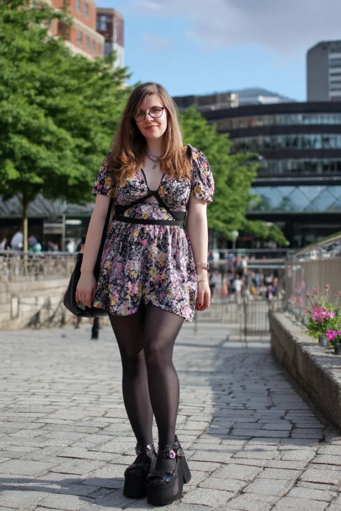 I find this combination absolutely genius because it’s the perfect blend of soft and hard, which is what mixed-style dressing is all about. The floral print and the shape of the dress scream cottagecore or a soft boho moment, but then those massive platforms instantly inject that playful grunge or goth element we love. The black tights tie everything together seamlessly, making the whole outfit feel cohesive and daring. It’s a fun way to wear a cute dress when you also want to feel a little bit badass.