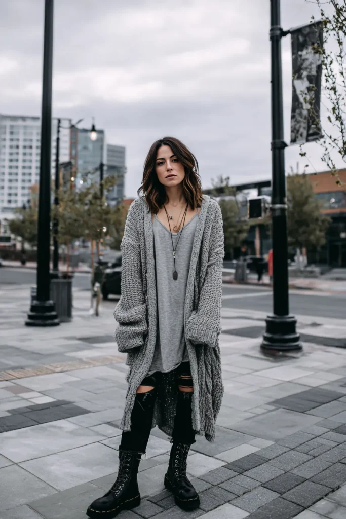 I think this combination works because it masters volume control in the best way possible. That gigantic gray cardigan is the ultimate cozy piece, giving off total carefree boho energy, but the streamlined black ripped jeans and the heavy boots instantly pull it into grunge territory. The way the top peeks out just slightly at the bottom adds a bit of visual interest without fighting the length of the cardigan. It’s the perfect outfit when you want to feel wrapped up and warm but still look effortlessly cool while running errands or grabbing coffee.