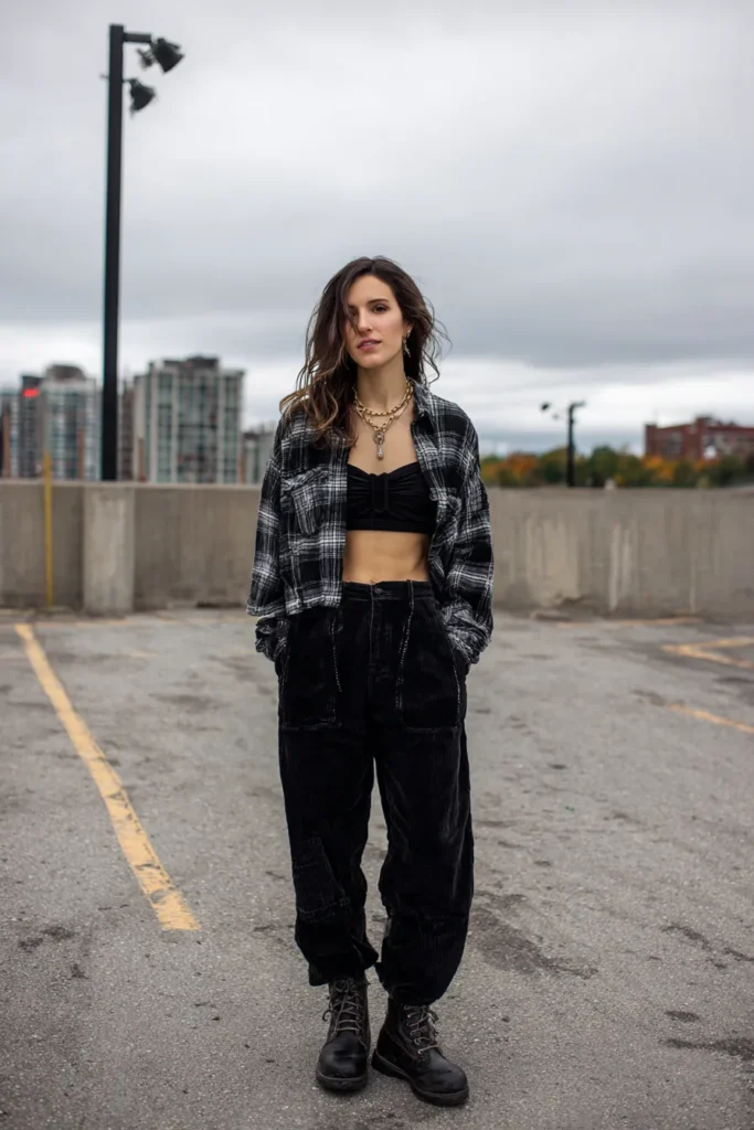 This outfit is a fantastic modern take on classic grunge style, perfect for a cool, overcast day in the city. The look layers a cropped black and white plaid shirt worn open like a jacket over a simple black bandeau or bra top, showing off a sliver of midriff. This is balanced by slouchy, high-waisted black corduroy pants with gathered or cinched ankles for a voluminous silhouette. The ensemble is finished with sturdy, slightly worn black lace-up combat boots and layered gold chain necklaces.