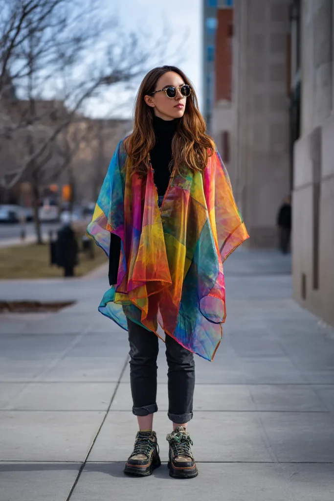 This outfit is an amazing burst of color against an urban backdrop, perfectly blending high-vibe bohemian layering with practical, edgy footwear. The core pieces are a fitted black turtleneck or mock neck top layered under a wildly colorful, sheer organza or chiffon poncho or kimono featuring abstract, vibrant tie-dye patches. This dramatic topper is paired with slim-fitting dark wash or black denim jeans that are casually cuffed above chunky, technical-looking hiking boots with contrasting laces and thick soles. Round, tinted sunglasses complete the energetic, ready-for-anything feel.