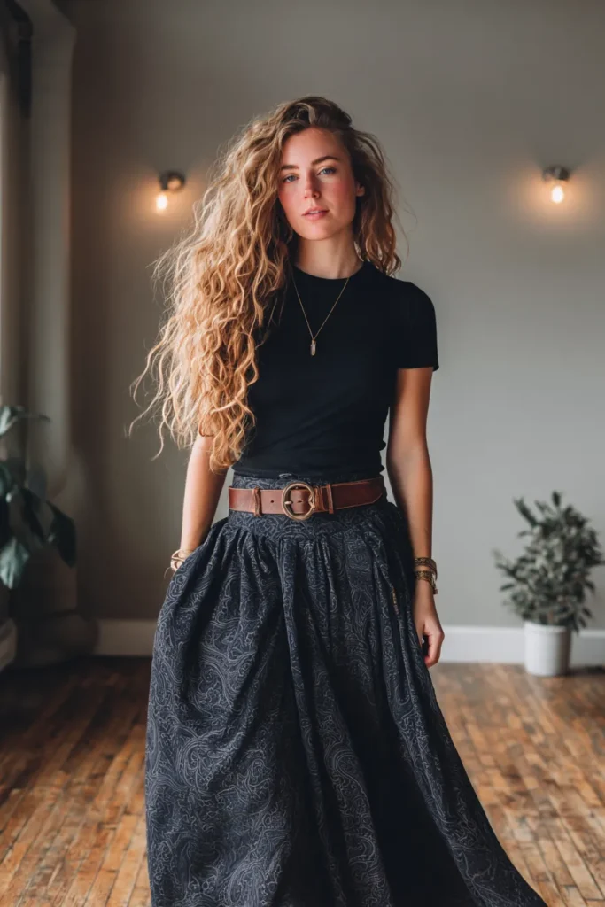 This look is a sophisticated, grown-up take on bohemian style with a grounding grunge element that keeps it cool. It features a fitted, short-sleeved black top tucked neatly into a voluminous, full-length maxi skirt in a dark charcoal or black fabric printed with a subtle, lighter paisley or swirl pattern. The entire waist is defined by a thick, rich brown leather belt with a large circular buckle, and the look is finished with layered delicate gold necklaces and stacked bracelets.