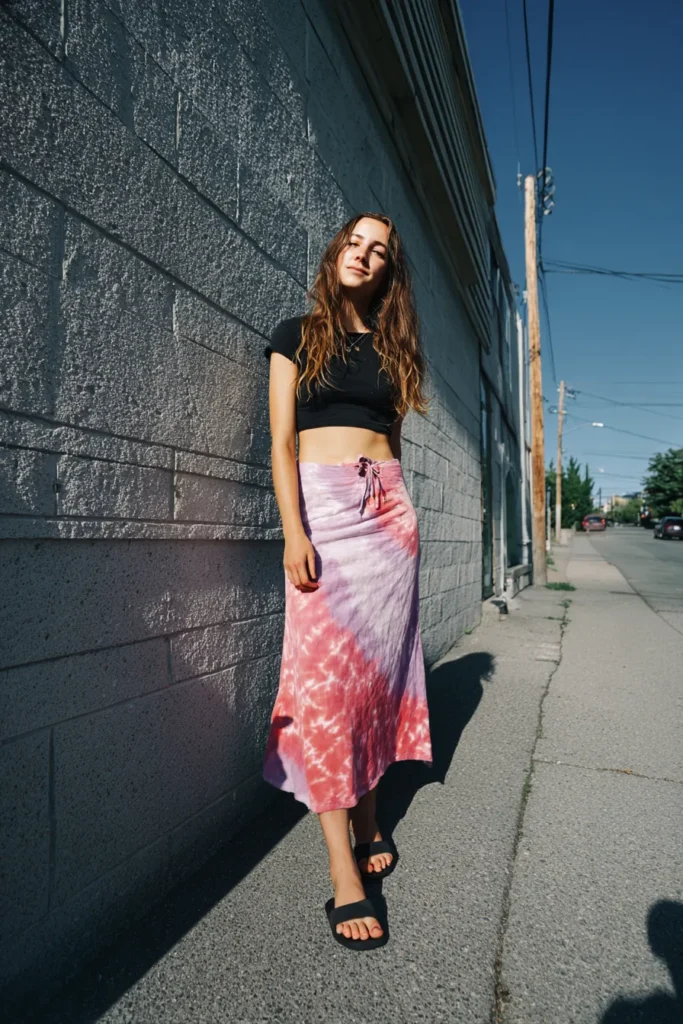 This outfit is pure carefree summer ease embodying that relaxed 90s grunge meets bohemian style perfect for a hot sunny afternoon. She is wearing a mid-calf length midi skirt featuring a soft tie-dye pattern blending pinkish-red and lavender purple tones, complete with an adjustable drawstring tie at the waist. This colorful bottom is balanced by a simple, fitted black short-sleeved crop top that hits right above the skirt’s waistband. Finishing the look are simple, flat black slide sandals that keep the focus entirely on the skirt and the warm weather vibe.
