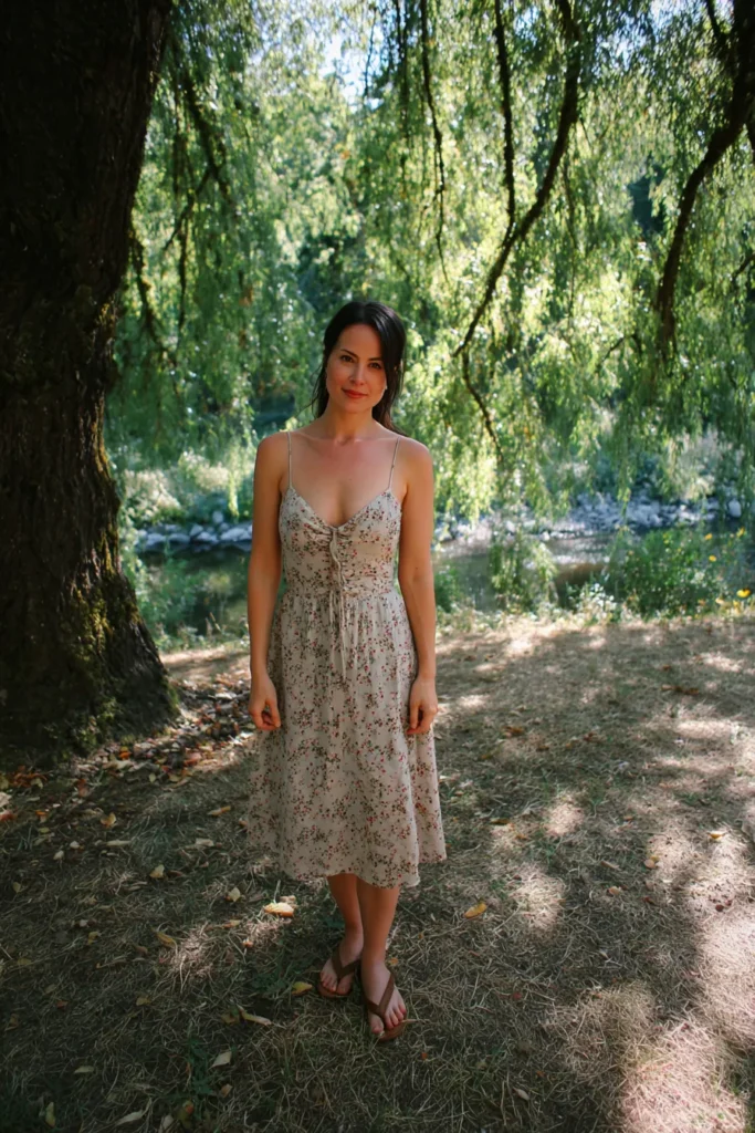 I think this look works so well because it embodies that beautiful, natural simplicity we often crave in the summer. The flowy fabric and the sweet floral print feel inherently feminine and relaxed, and standing under that big leafy tree just completes the whole ethereal vibe. Keeping the footwear as simple as flat sandals means you are ready for a picnic or a walk by the water with zero fuss. I feel like I could wear this when I want to feel completely comfortable and pretty without having to try too hard at all.
