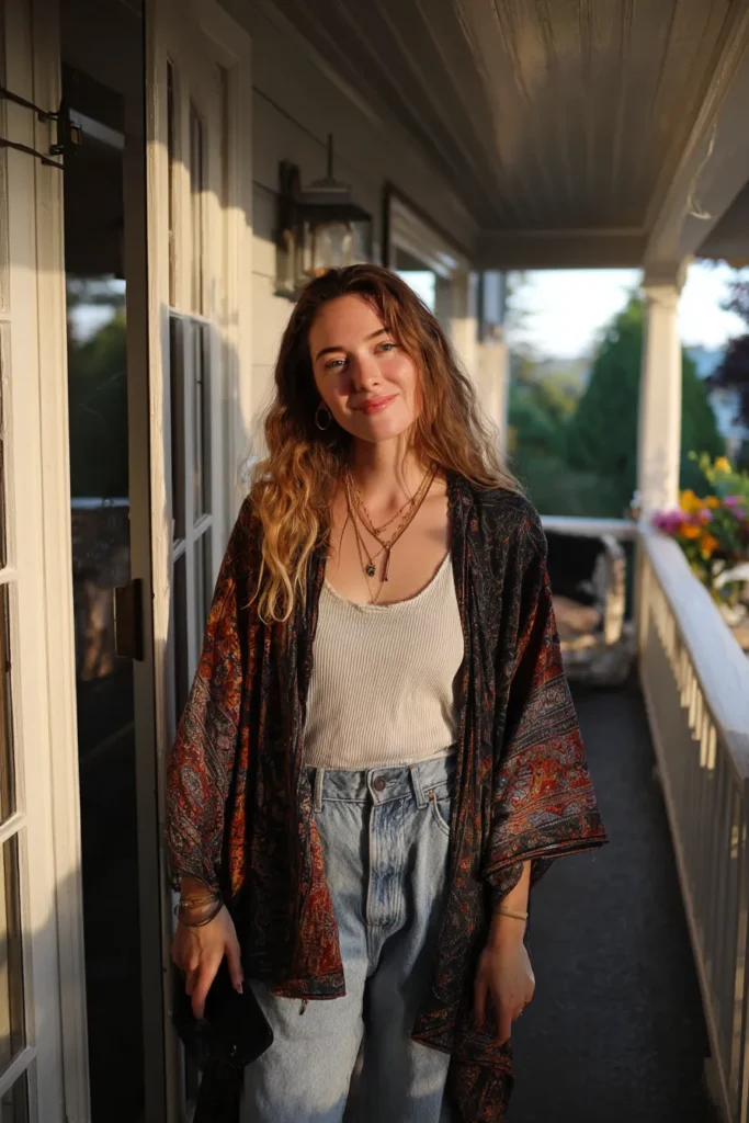 This look is the ultimate cool-girl combination of soft prints and relaxed denim for that perfect in-between weather. She is sporting a gorgeous, flowing kimono or duster jacket featuring a rich, dark paisley print with rust orange and brown tones that adds beautiful movement. Underneath the layer, she keeps it simple with a fitted, light beige or cream ribbed tank top featuring delicate lace trim at the neckline. The bottom half consists of light-wash, slightly loose-fitting jeans, perhaps a mom or straight-leg style, tucked at the waist. She accessorizes with a collection of layered gold necklaces for that essential boho touch.