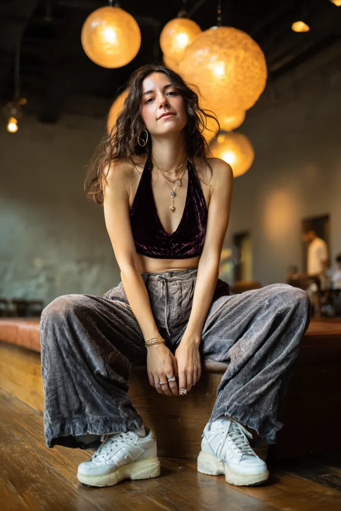 This look is giving major 90s club kid meets cozy bohemian goddess energy perfect for a stylish evening hangout. She is wearing a rich dark plum or burgundy velvet halter top that has a soft cowl neckline and cuts off just above the waist showing a hint of skin. This plush top is paired with high-waisted, extremely wide-leg trousers made from a muted grey or taupe fine-wale corduroy fabric that gathers beautifully at the waist. Accessorizing is key with several delicate layered gold necklaces and chunky white platform sneakers that add a bold sporty contrast.