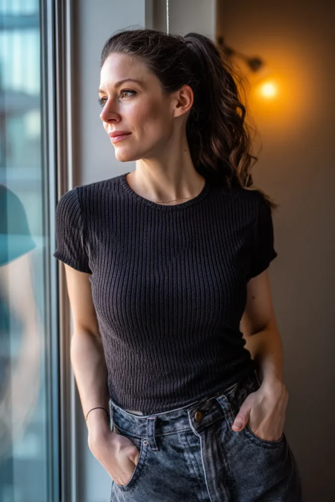 I find this combination incredibly flattering because it relies on great fit and texture rather than loud colors. That ribbed black top clings just right and really highlights your shape, which is then perfectly balanced by the more relaxed, slightly baggy fit of those high-waisted, washed-out jeans. It’s an easy recipe for looking chic when you are keeping things simple. It has that understated coolness that was everywhere in the nineties, proving you don’t need fuss to look absolutely amazing. I think everyone needs a basic ribbed tee like this in their wardrobe for instant effortless style.