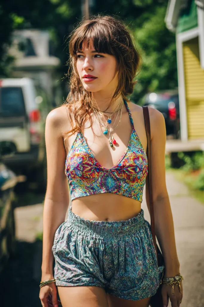 This look is all about embracing vibrant color and carefree summer energy. It features a matching two-piece set perfect for warm days. The top is a halter-style crop top with a fun, colorful print that looks almost tie-dye or psychedelic paisley, crisscrossing at the bust. On the bottom, we have flowy, smocked shorts in a slightly muted but still intricate pattern, echoing the top’s bohemian spirit. The look is accessorized with multiple layered gold necklaces featuring colorful stone pendants and some chunky bracelets, giving it that essential, well-traveled, festival-ready feel.