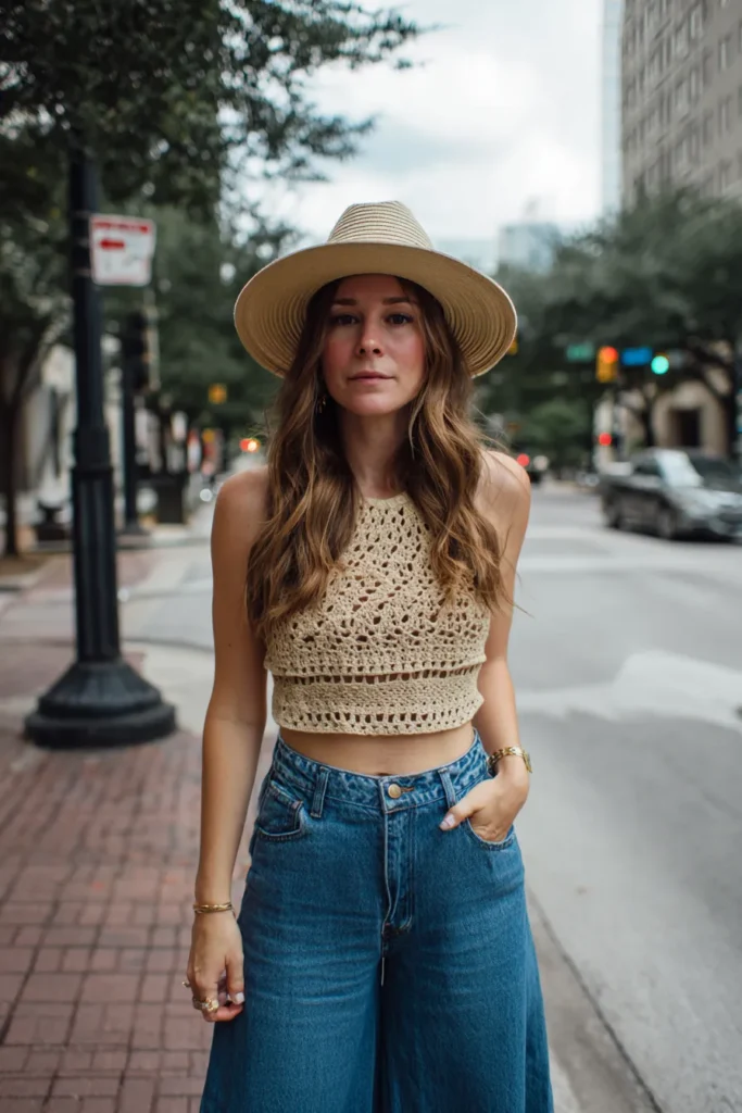 This outfit nails that relaxed boho vibe that somehow feels both casual and cool. The woman is wearing a beige crochet crop top paired with high-waisted wide leg jeans in a soft blue wash. The natural texture of the top adds that handmade charm, while the hat brings in a sunny, laid-back touch that completes the look. The loose waves in her hair and minimal gold jewelry make it feel perfectly effortless.