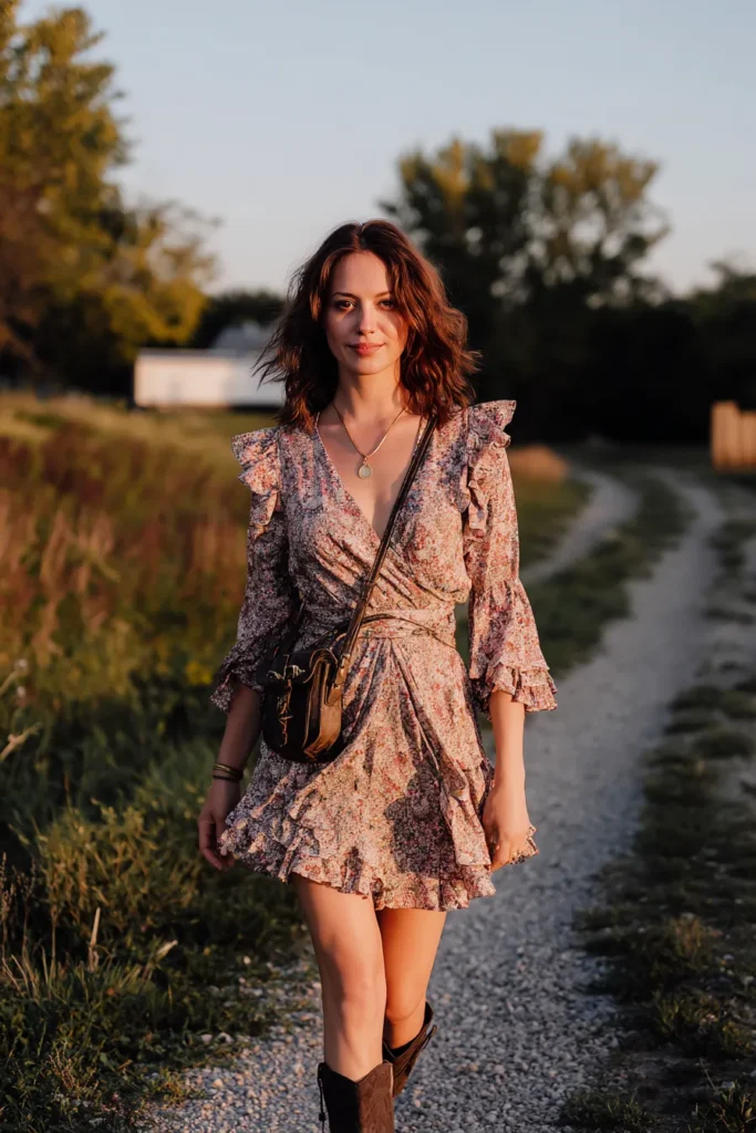This outfit captures that effortless countryside charm I always associate with boho style. The woman is wearing a soft floral wrap dress with ruffled edges that move beautifully as she walks. The lightweight fabric and muted tones give it a relaxed, feminine feel. Her crossbody leather bag adds a touch of practicality while keeping the outfit grounded. Paired with classic brown boots, it feels both romantic and down-to-earth.