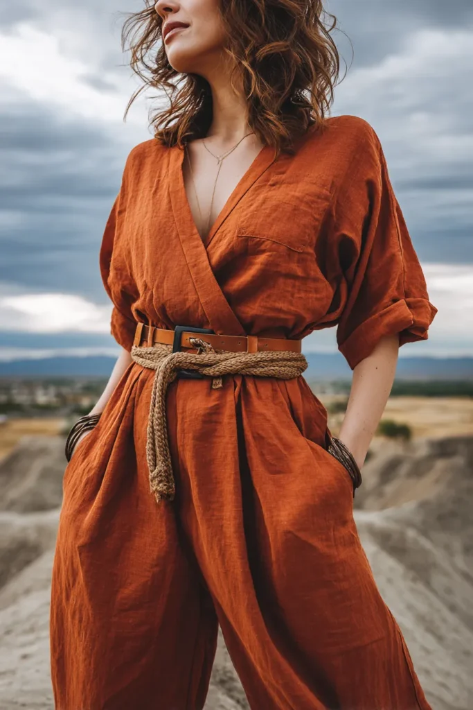 This look is pure boho confidence in one outfit. The woman wears a deep terracotta jumpsuit made from soft, breathable linen that drapes beautifully. The sleeves are casually rolled, and the waist is cinched with a braided rope belt layered over a tan leather one, giving that lived-in, earthy vibe. The color feels warm and grounded, while her minimal jewelry and relaxed hair add to the effortless charm.