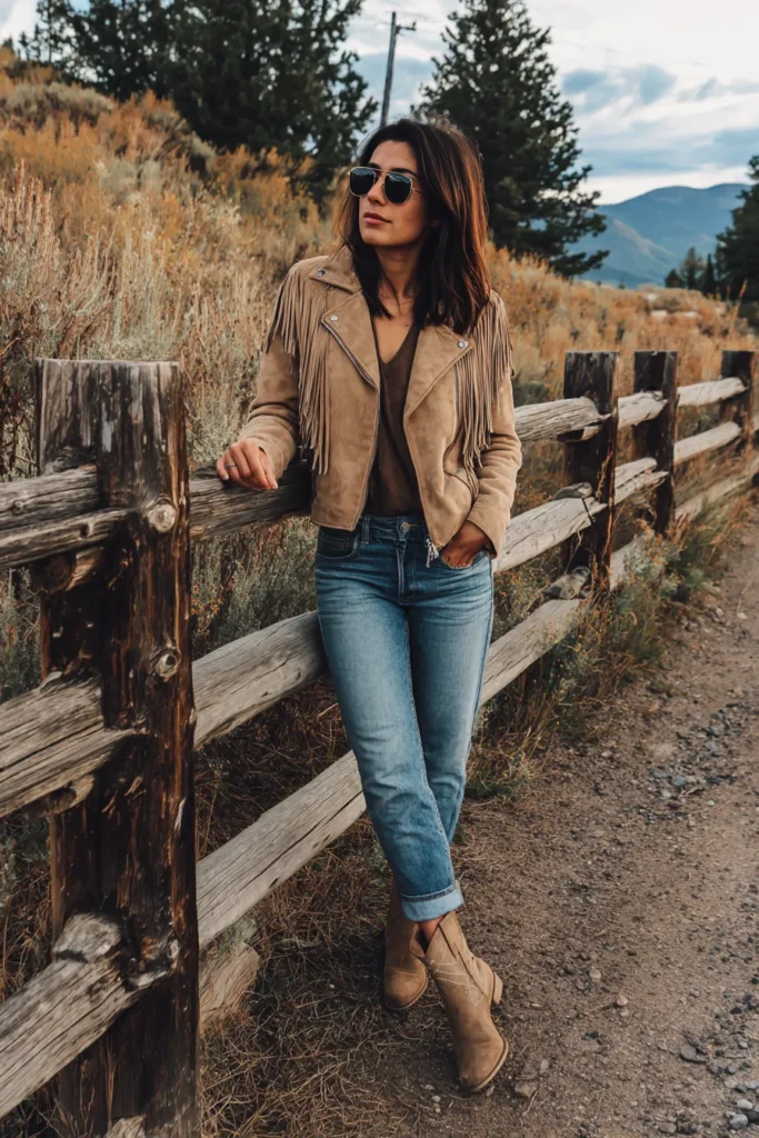 This outfit gives major western-boho energy in the best possible way. The woman is wearing a light tan suede fringe jacket over a simple brown top, paired with relaxed blue jeans and ankle boots. The textures work perfectly together, from the soft suede to the slightly faded denim. Her aviator sunglasses add just the right amount of attitude, and the rustic outdoor backdrop makes the whole look feel natural and adventurous.