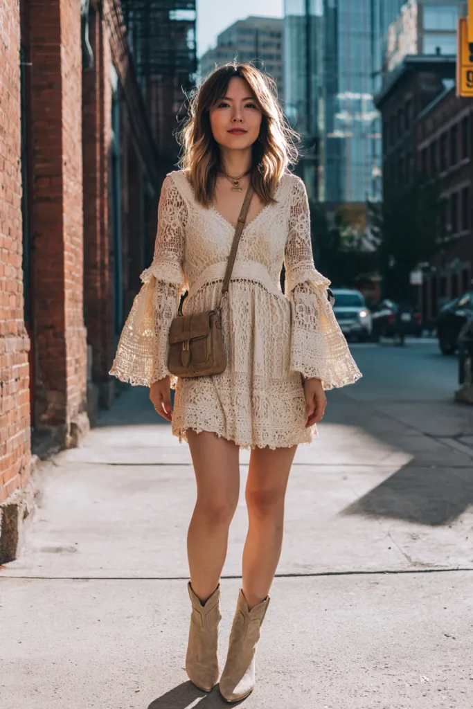 This outfit feels like a love letter to classic boho femininity. The woman is wearing a cream lace mini dress with flared bell sleeves and delicate crochet details that catch the sunlight perfectly. The soft, airy fabric gives it that dreamy texture, and the neutral crossbody bag ties the whole look together. Paired with beige suede ankle boots, it strikes a beautiful balance between sweet and effortlessly cool.